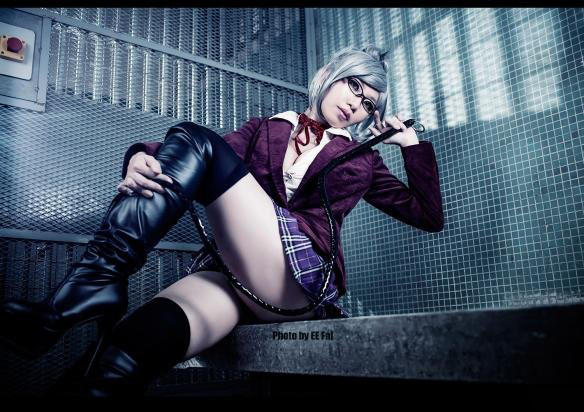 白木芽衣子是《监狱学园》这部动漫中的学生会副会长,典型S女王标配皮鞭紧身校服,担任了最大福利角色,身材傲人。汗腺十分发达,总会大汗淋漓让人浮想联翩。香港的COSER:Aki将副会长的姿态气场进行神还原。